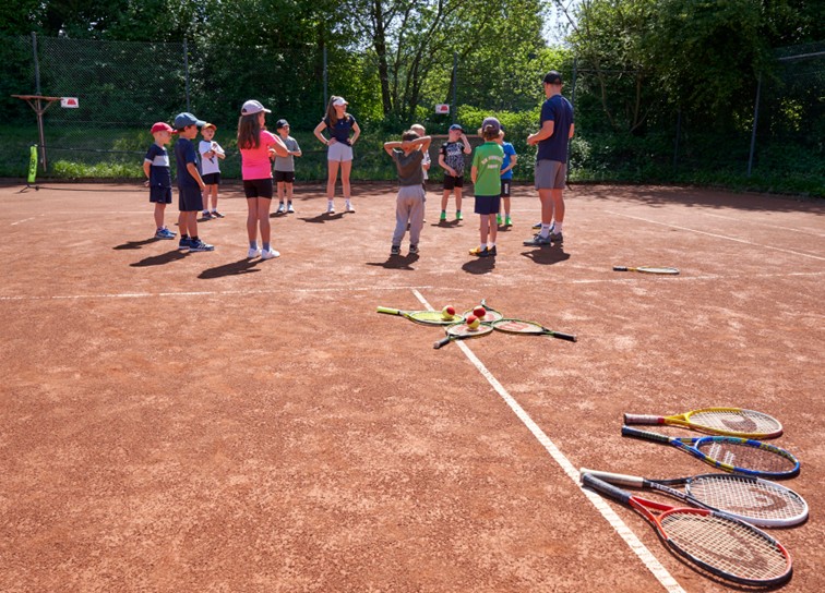 In der jeweils letzten Woche der Sommerferien veranstaltet der Verein zusammen mit der Tennisschule Neuendorff ein oder mehrere Jugendcamps. Eine Woche lang intensives Tennistraining, gemeinsames Mittagessen aber auch Zeit für andere Sportarten und Toben im Schwimmbad. Im Laufe des Jahres gibt es nicht nur Tennisangebote, sondern auch weitere sportliche Angebote, die vom Verein mitfinanziert werden. Denn in der Gruppe macht Sport am meisten Spaß. Im Bild das Jugendcamp 2021.